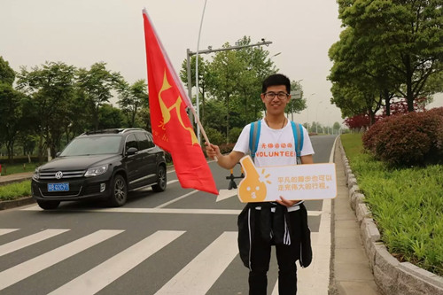 A volunteer guides hikers with a sign and a flag at an intersection, May 7. More than 1,000 volunteers were recruited for the event. [Photo provided to China Daily] |