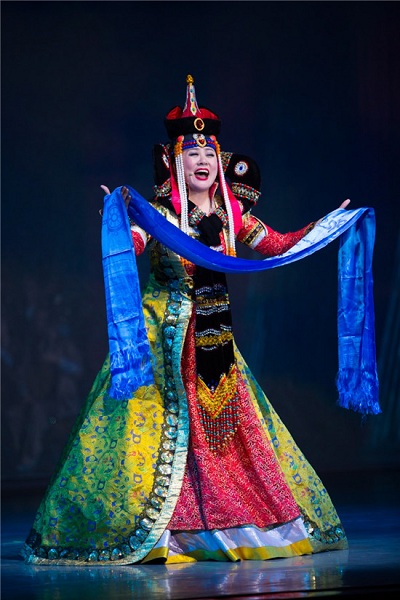 A soprano dressed in traditional Mongolian costume sings at the concert. [Photo provided to chinadaily.com.cn]