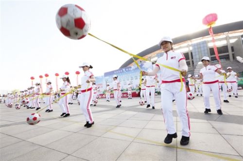 | Baotou residents perform during the opening ceremony of a sports meeting on May 6. Held in celebration of the 70th anniversary of the founding of Inner Mongolia autonomous region, the sports meeting will run until October. [Photo/Baotou Evening News] |