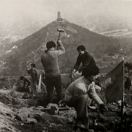 Wuxi natives remove rocks to plant trees on Huishan Mountain in 1982. [Photo provided to chinadaily.com.cn]