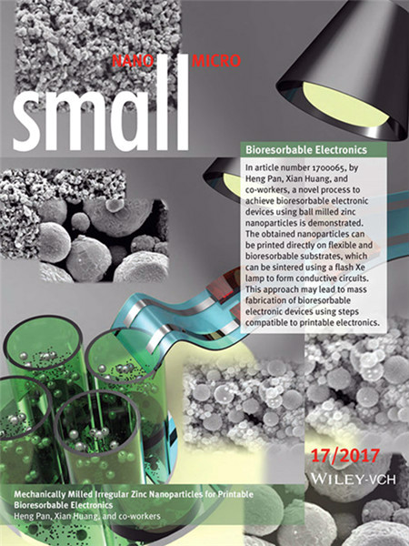 | The paper Mechanically Milled Irregular Zinc Nanoparticles for Printable Bioresorbable Electronics was published in Small as a cover story. [Photo/Tianjin University] |
