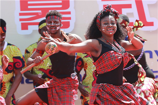 | A dancing show called Ebullient Africa is performed by foreign students during the opening ceremony of the 10th International Culture Festival on May 6. [Photo/Xinhua by Wang Xiaoming] |