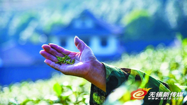 A tea grower in Bai Ta Cun, Yixing, Wuxi, shows a handful of freshly-picked tea leaves. [Photo/wxrb.com]