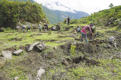 | Experts from South Subtropical Crops Research Institute in Zhanjiang and the Tibet Academy of Agricultural and Animal Husbandry Sciences plant macadamia nuts trees at Tibet's Medog county in late April to help improve its agriculture. [Photo provided to China Daily] |