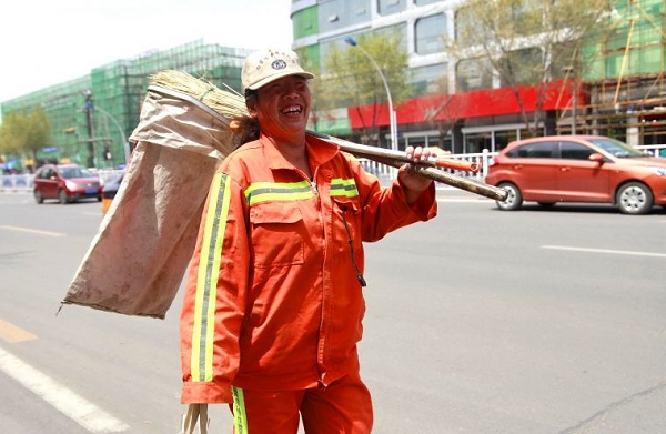| A sanitation worker laughs at the camera while walking on the roadside on May 8. [Photo/Inner Mongolia Daily] |