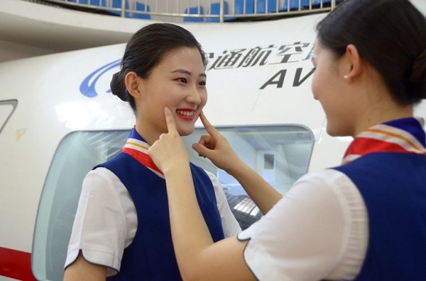 | College students majoring in flight stewardess training practice smiling at Inner Mongolia Normal University on May 8. [Photo/Inner Mongolia Daily] |