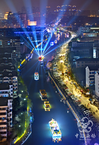 Illuminated touring boats cruise along the ancient canal at night in Wuxi. [Photo provided to chinadaily.com.cn]
