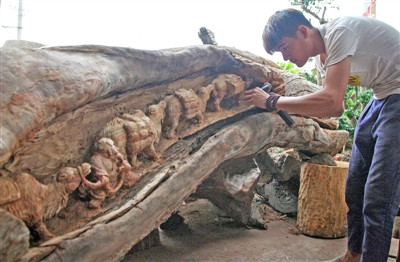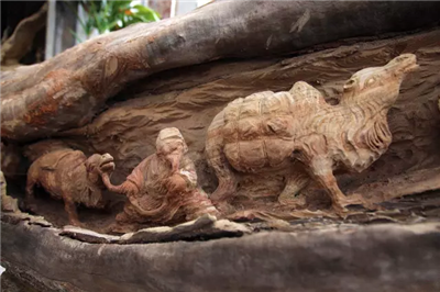 A camphorwood tree is carved to depict merchants leading camels through caves along the ancient Silk Road. [Photo/Zhanjiang Evening Post]