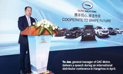 | Yu Jun, general manager of GAC Motor, delivers a speech during an international distributor conference in Hangzhou in April. |