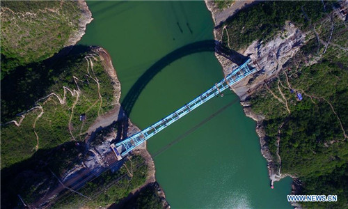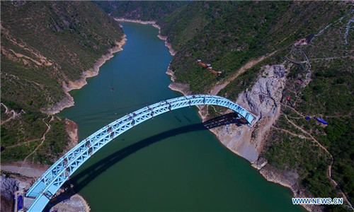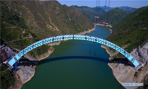 | Aerial photo taken on April 30, 2017 shows Luohe Bridge after closure of arch rib along the under-construction railway spanning from north China's Inner Mongolia Autonomous Region to central China region in Lushi County of Sanmenxia City, central China's Henan Province. (Xinhua/Ou Wei) |