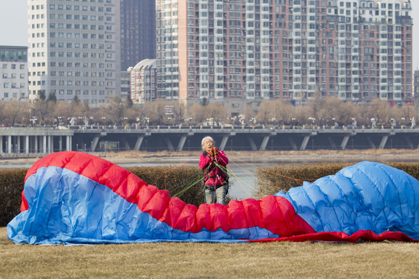 Li gathers up her parachute after a flight. [Photo by ZHU WANCHANG/CHINA DAILY]