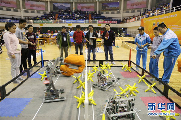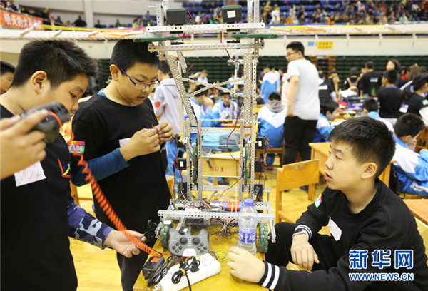 The competition included five competitive events -- a comprehensive skill competition and robot creativity contest as well as the regional competitions for First LEGO League (FLL), VEX Robotics Competition, and World Educational Robot Contest. [Photo/Xinhua]