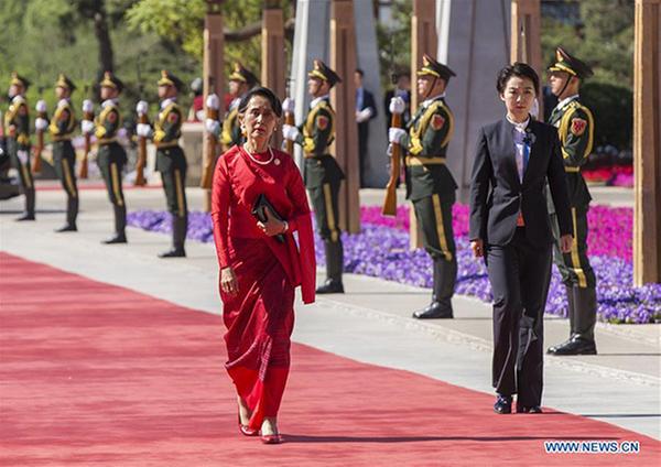 Myanmar State Counselor Aung San Suu Kyi arrives for the Leaders' Roundtable Summit at the Belt and Road Forum (BRF) for International Cooperation at Yanqi Lake International Convention Center in Beijing, May 15, 2017. [Photo/Xinhua]
