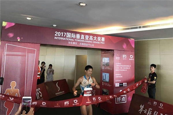 Zeng Wenbo crosses the finish line on the top floor of Wuxi IFS in 7 minutes and 41 seconds, the winning time in the men's group. [Photo provided to chinadaily.com.cn] |