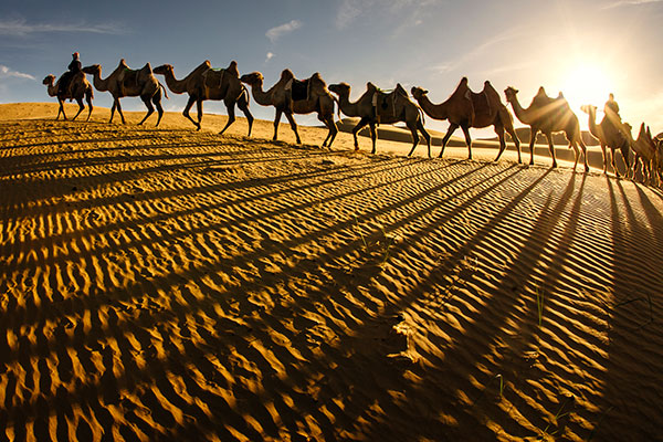 | A camel caravan trots over the Xiangshawan (Sounding Sand) Desert in Erdos, Inner Mongolia autonomous region. [Photo provided to China Daily] |