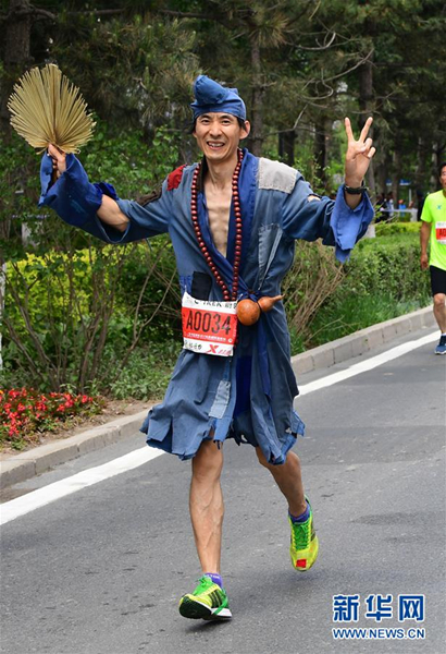 A marathon runner takes on the race while dressed like Ji Gong -- a well-known, knowledgeable, kind monk from Chinese history who always wore shabby clothes. [Photo/Xinhua]