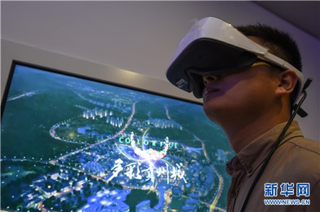 | A visitor tests a VR headset in Guizhou Shuanglong Airport Economic Zone's exhibition center. Covering 2,468 square kilometers, the exhibition center is a leading big data experience center open to public visitors. [Photo by Ou Dongqu/gz.xinhuanet.com] |