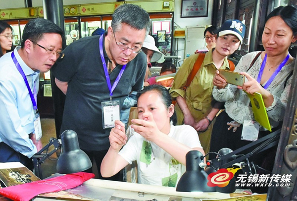 Native Wuxi celebrities view a demonstration of embroidery techniques on May 21. [Photo by Fan Hua / wxrb.com]