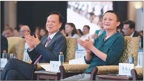 | Chen Min'er (left), Guizhou's provincial Communist Party of China chief, applauds with Alibaba's Jack Ma at the opening ceremony of the 2017 China International Big Data Expo on Friday in Guiyang.Deng Gang / For China Daily |