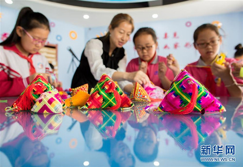 | Under the guidance of a teacher, students make multicolored sachets of zongzi at Hengchangdian Primary School. [Photo/Xinhua] |