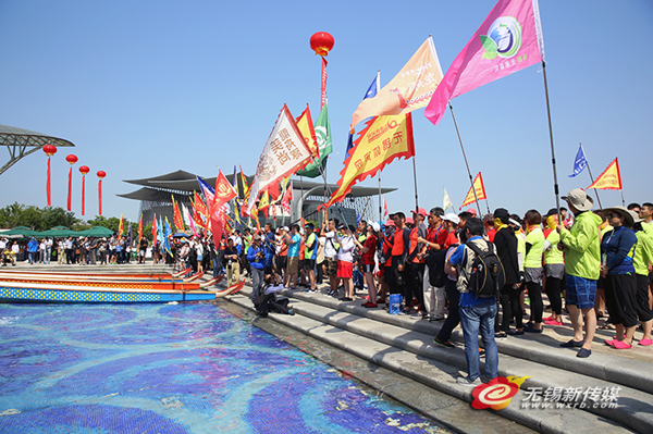 Participants of the dragon boat racing hold flags and wait for the game opening near the Lihu Lake in Wuxi, on May 29. [Photo/ wxrb.com]