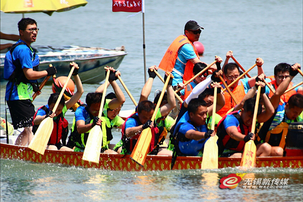 Wuxi residents compete in the dragon boat racing in Wuxi's Lihu Lake, on May 29. [Photo/ wxrb.com]