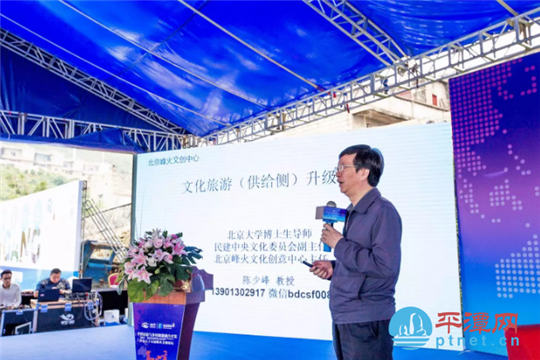 | Chen Shaofeng, deputy director of Peking University's culture industry institute, delivers a speech during the rural tourism development forum in Pingtan. [Photo provided to chinadaily.com.cn] |