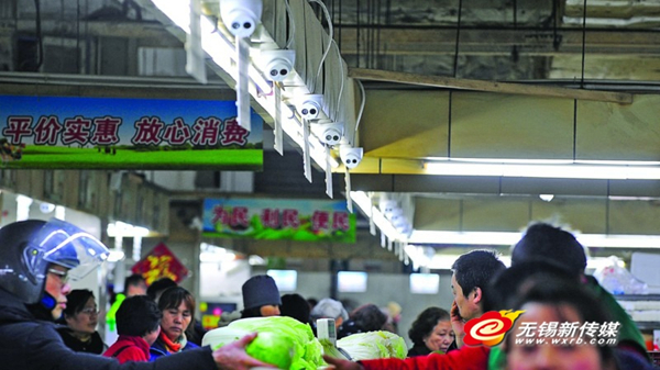 | Dozens of digital monitors are newly installed above trading booths at Chaoyang Agricultural Market in Wuxi's downtown Zhongshan Road. [Photo/wxrb.com] |