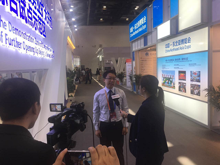 | A reporter interviews a staff member of the 11th China-Northeast Asia Expo at the 2017 China Beijing International Fair for Trade in Services held in Beijing from May 28th to June 1st. [Photo provided to chinadaily.com.cn] |
