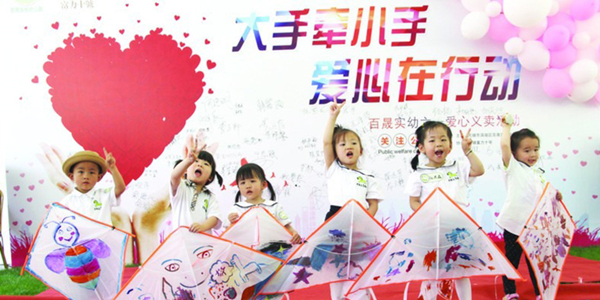 More than 70 kids at Wuxi Palsm Kindergarten sell kites they have decorated themselves for charity. More than 2,000 yuan was raised and donated for poor households in the city's Binhu district. [Photo by Chen Yi / wxrb.com]