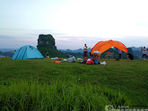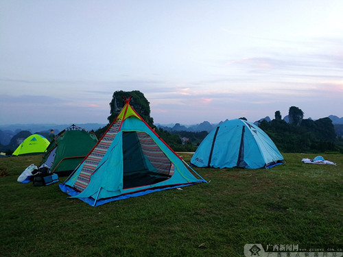 Tourists camp in Gaoshan Grassland in Luocheng. [Photo by Liao Guangfu for chinadaily.com.cn] |