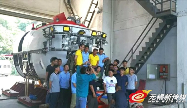The research and development team takes a photo with China's second manned submersible, which is capable of descending over 4,500 meters, at China Ship Scientific Research Center in Wuxi. [Photo / wxrb.com] |
