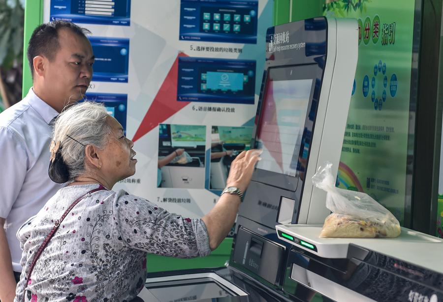 An aged woman weighs kitchen waste under the instruction of a staff worker at a community waste classification site in Yantian district of Shenzhen, South China's Guangdong province, April 28, 2017. [Photo/Xinhua]