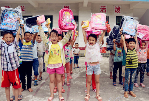 | Children hold up their presents for International Children's Day at Dazhu village primary school on June 1. [Photo by Liao Guangfu/gx.xinhuanet.com] |