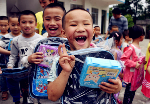 | Children smile in Dazhu village as they celebrate International Children's Day with gifts on June 1. [Photo by Liao Guangfu/gx.xinhuanet.com] |