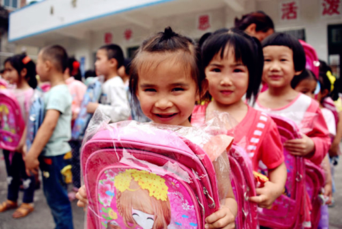 Students at the primary school of Jian'ai township Dazhu village in a remote mountain area of Luocheng Mulao autonomous county received presents from officials of the local safety production supervision bureau on June 1, the International Children's Day.