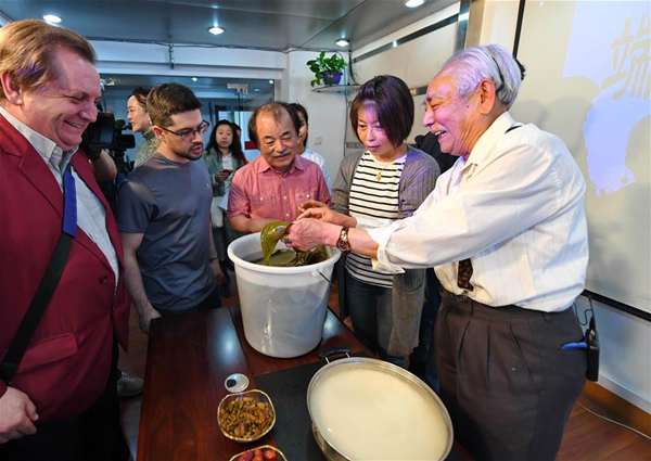 Shao Bingyuan, a folk-custom expert (first from right), demonstrates how to make zongzi, a traditional Chinese food made during the Dragon Boat Festival. [Photo/Xinhua] |