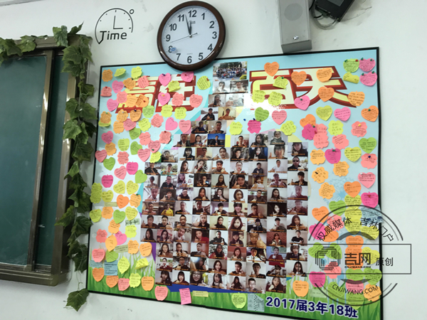 | Photos of past graduates are pasted onto the wall in a thumbs-up shape to encourage students. [Photo/chinajilin.com.cn] |