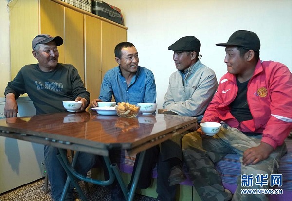 After a day’s work, Feng Zhanxi (second from left) drinks milky tea with herdsmen working in his pasture. [Photo/Xinhua] |