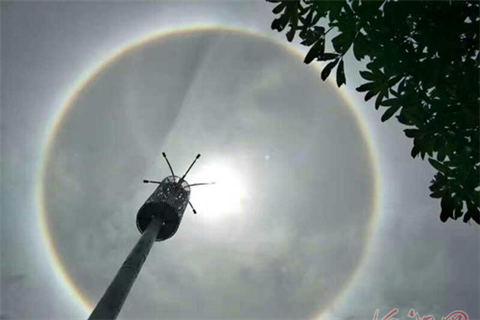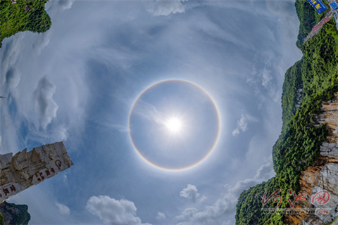 | A colorful circle around the sun, the halo is created by the refraction of sunlight when it travels through ice crystals in the clouds. [Photo by Pu Jiayong/Hechi Daily] |