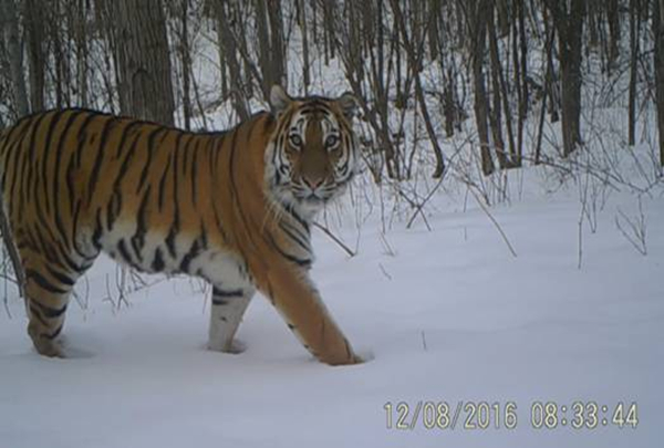 The first male Manchurian tiger was discovered on June 8, 2016, and a female one was filmed on Dec 8, 2016, and April 22, 2017, which was also the first time such clear images of these wild animals had been captured.