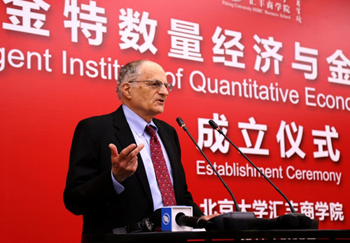 | Nobel laureate Thomas Sargent addresses at the establishment ceremony of the research center in Shenzhen on June 8. [Photo provided to chinadaily.com.cn] |