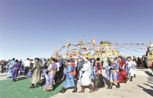 | Members of China’s ethnic Mongolian group circle an ovoo while wearing traditional Mongolian dress, June 7. The participants presented sacrificial offerings and khata to the ovoo. Khata scarves, which symbolize purity and compassion, are presented at many ceremonial occasions, including births, weddings and the arrival or departure of guests. [Photo/Baotou Daily] |
