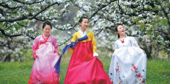 | Ladies enjoy the view of pear blossoms in the Yanbian Korean autonomous prefecture. [Photo provided to China Daily] |
