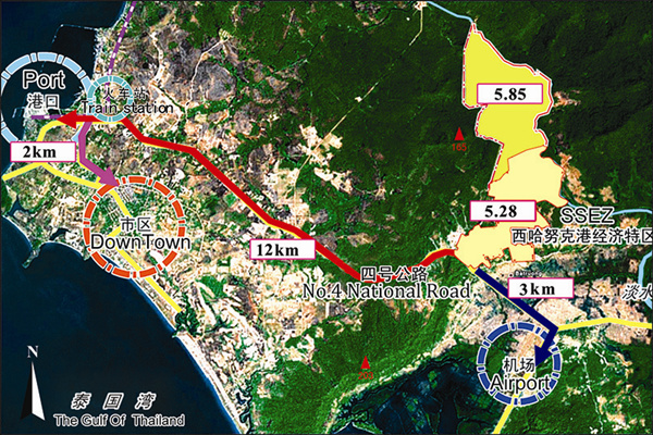 A map shows the location of the airport in Sihanoukville, Cambodia and its distance from the port, economic zone and downtown area. [Photo provided to chinadaily.com.cn] |