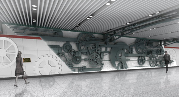 Public art pieces of forward-moving wheels connected to sets of gears, spindles, and pipes are placed at Qingfeng and Yikuangjie stations. The mechanical elements embody Changchun's auto culture and industrial civilization throughout the years.
