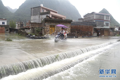 | Water floods over the roads in Nanping viallge, Luocheng Mulao autonomous county, Hechi. [Photo by Wu Yaorong/Xinhua] |