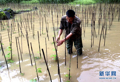 | A farmer in Siba township, Luocheng Mulao autonomous county work in the field to rescue the paddy shoots. [Photo by Wu Yaorong/Xinhua] |