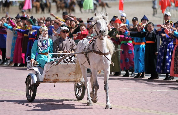 A horse parade performs at the Sebin Nadam Fair held in Ewenki Autonomous Region, Hulunbuir League, Inner Mongolia autonomous region, on June 18. Nadam usually features a wide range of outdoor sports activities, such as horse racing, Mongolian wrestling, camel racing, and archery. [Photo/nmgnews.com.cn]