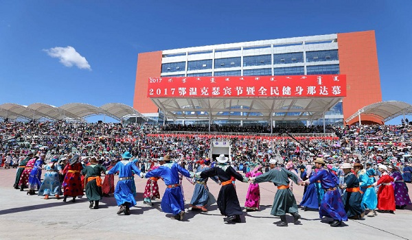 People circle to perform the traditional Mongolian dance at the Sebin Nadam Fair held in Ewenki Autonomous Region, Hulunbuir League, Inner Mongolia autonomous region, on June 18. Nadam usually features a wide range of outdoor sports activities, such as horse racing, Mongolian wrestling, camel racing, and archery. [Photo/nmgnews.com.cn]
